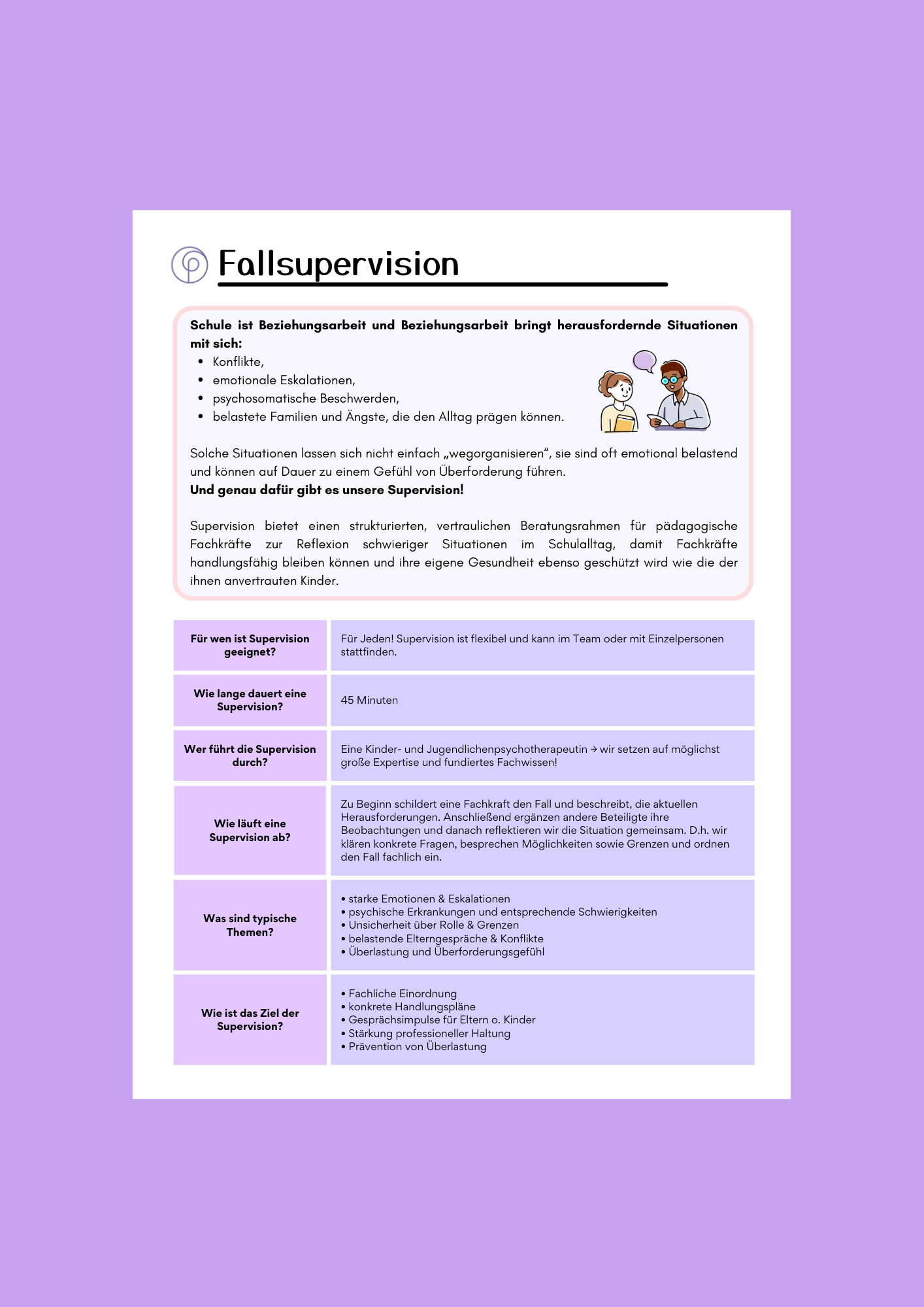 In dieser Übersicht erfährst du kompakt, wie unsere Fallberatung und Supervision abläuft, für wen sie geeignet ist und welche Unterstützung sie konkret bieten kann.